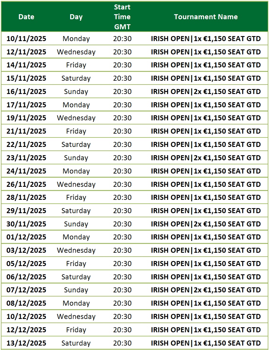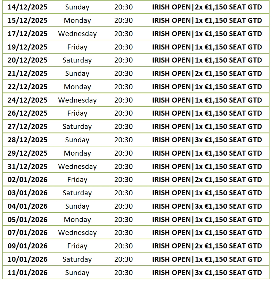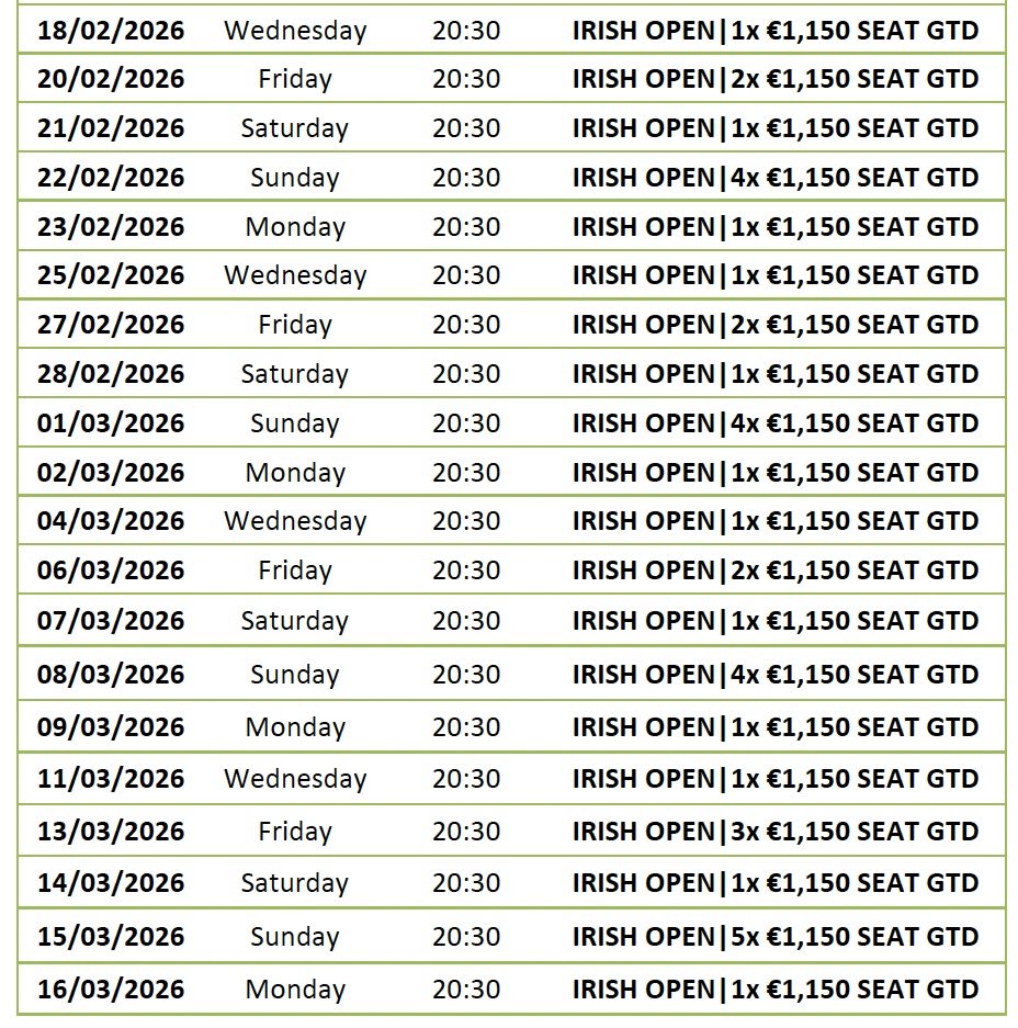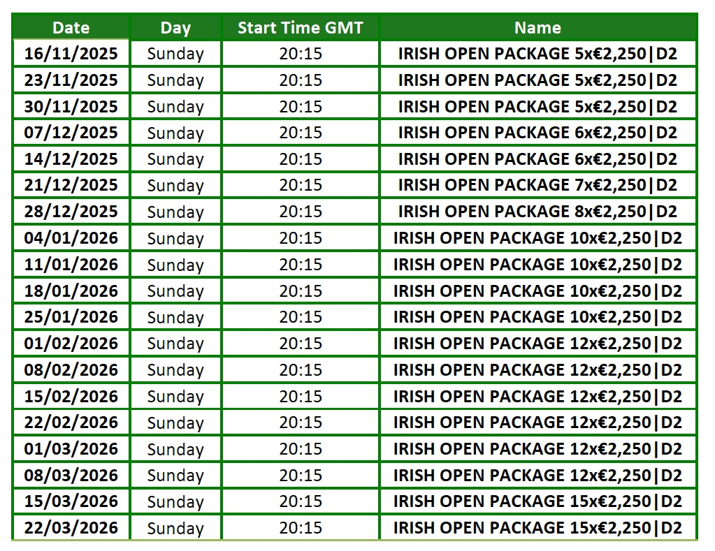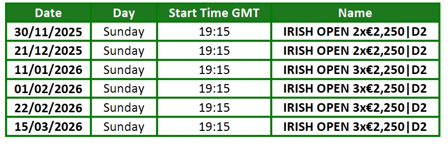 - “IRISH OPEN 2x€2,250|D2” (Day 2) on Sundays 30/11/2025, 21/12/2025, 11/01/2026, 01/02/2026, 22/02/2026 & 15/03/2026