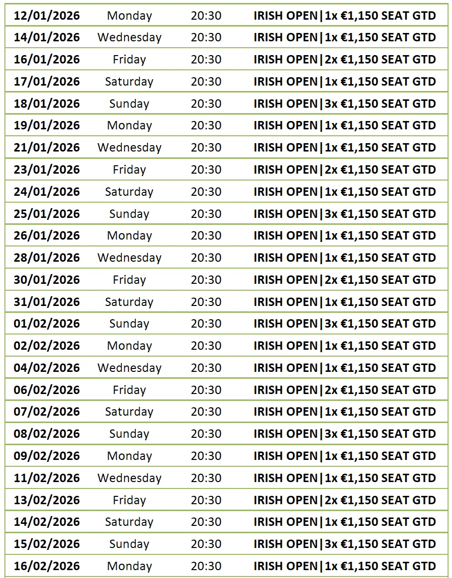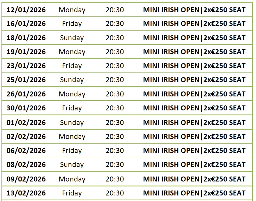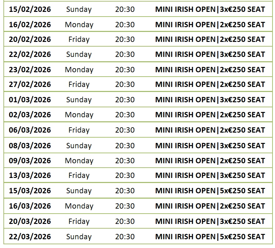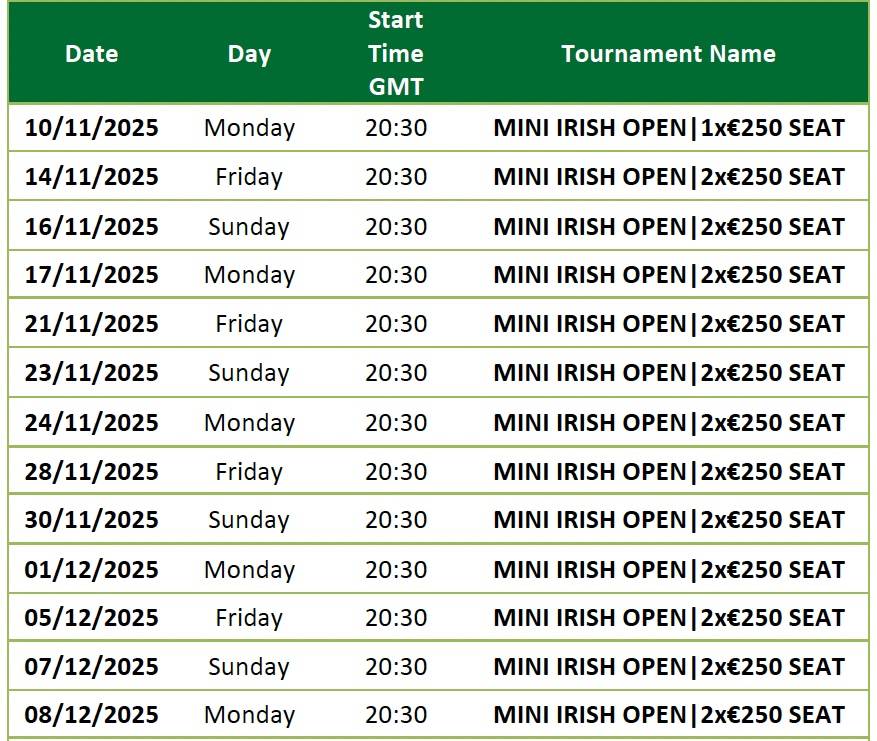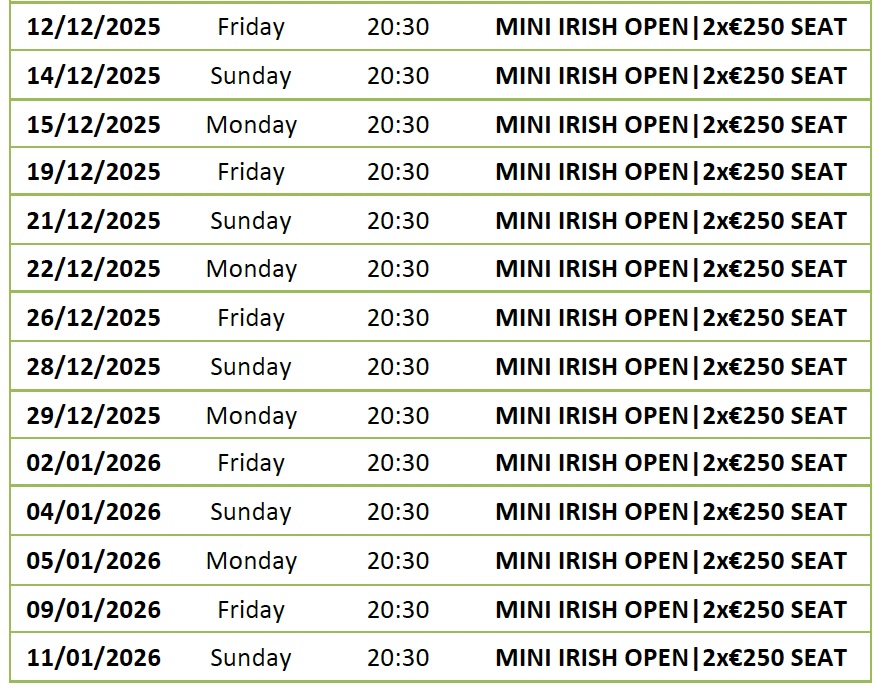 - “MINI IRISH OPEN|1x€250 SEAT” on Mondays, Fridays & Sundays during the promotion period, as detailed in the table below.