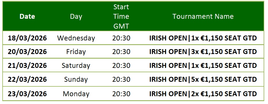 - “Mini Irish Open Day 1X - €1,000,000 GTD” from 26th March 2026 to 5th April 2026, buy-in of €250