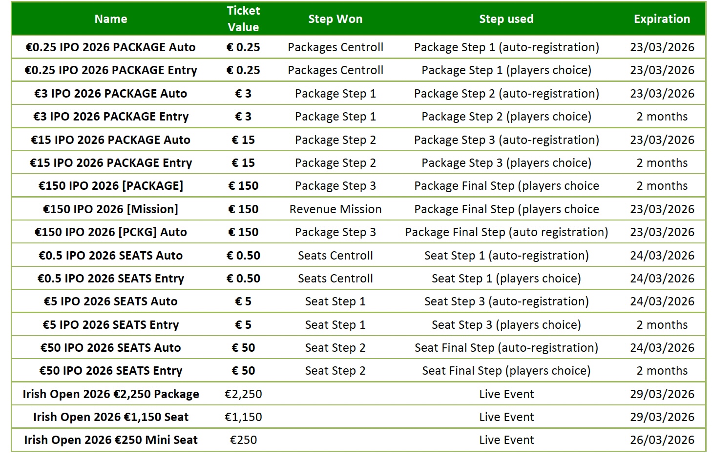 - “€0.25 IPO 2026 PACKAGE Entry”, “€3 IPO 2026 PACKAGE Entry”, “€15 IPO 2026 PACKAGE Entry”, “€150 IPO 2026 [PACKAGE]”, “€150 IPO 2026 [Mission]”, “€5 IPO 2026 SEATS Entry” and “€50 IPO 2026 SEATS Entry” entry tickets are valid only in “IRISH OPEN” tournaments during the promotion period and expire 2 months after having been issued. After the promotion period they will be linked to all tournaments.